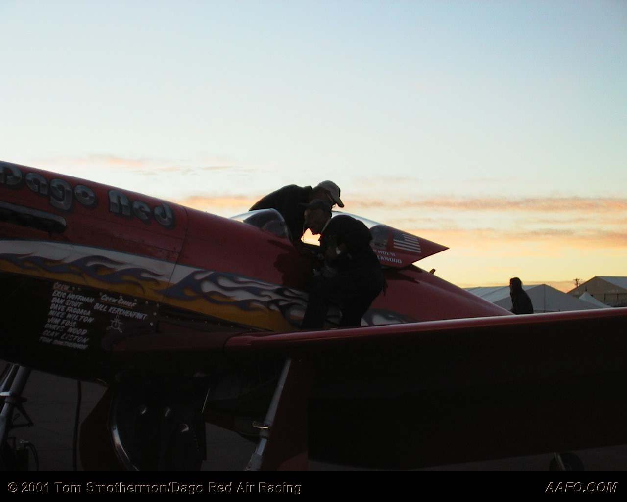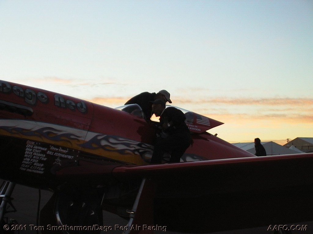 Dago Red crew members Bill "Kerch" Kerchenfaut and Mike Wilton prepare three time consecutive Reno National Championship Air Race winner "Dago Red" for her pilot Skip Holm during an early morning test session at the 2000 event.