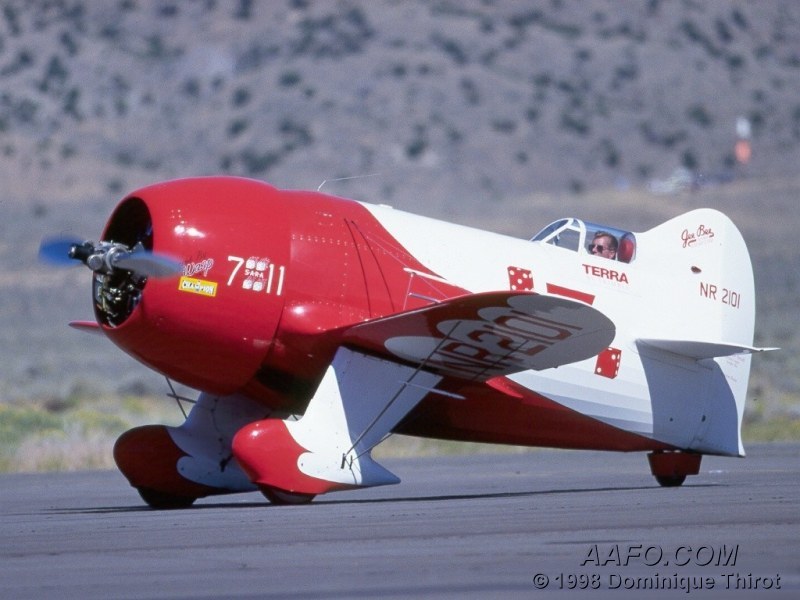Dominique Thirot captures Delmar Benjamin in his Gee Bee R-2 Replica at the 1998 Reno National Championship Air Races. Normally a fixture at the annual event, Delmar and his famous historic racer have been missed for two years. Will we see this fantastic airplane and Delmar's amazing performance in it next year at Reno? Cross your fingers and hope!!