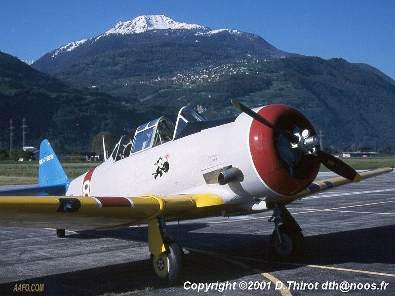 Well that's what we did when we were looking through Dominique Thirot's works from the 2001 Sion Switzerland Airshow! This colorful North American SN-J was shot by Dominique and the photograph certainly had us looking twice wondering what Steve Dilda was doing overseas with the T-6 Racing Association's pace plane! (click here to see more of this airplane in action)