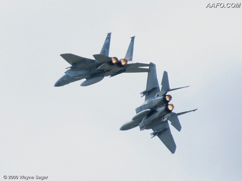 At the break, Lt. Col. Larry "Fudge" Packer of the Oregon Air National Guard, pulls away from his wingman on their last pass of the F-15 demonstration flight. Moments later, they began the return flight to Klamath Falls, Oregon and home base at Kingsley Field.